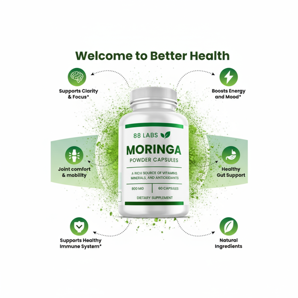 At 88 Labs, we harness the natural power of the Moringa Oleifera plant, known as the “Miracle Tree,” to create clean, effective supplements. Our Moringa capsules are rich in vitamins, minerals, antioxidants, and amino acids—supporting energy, immunity, anti-inflammatory, and overall wellness.